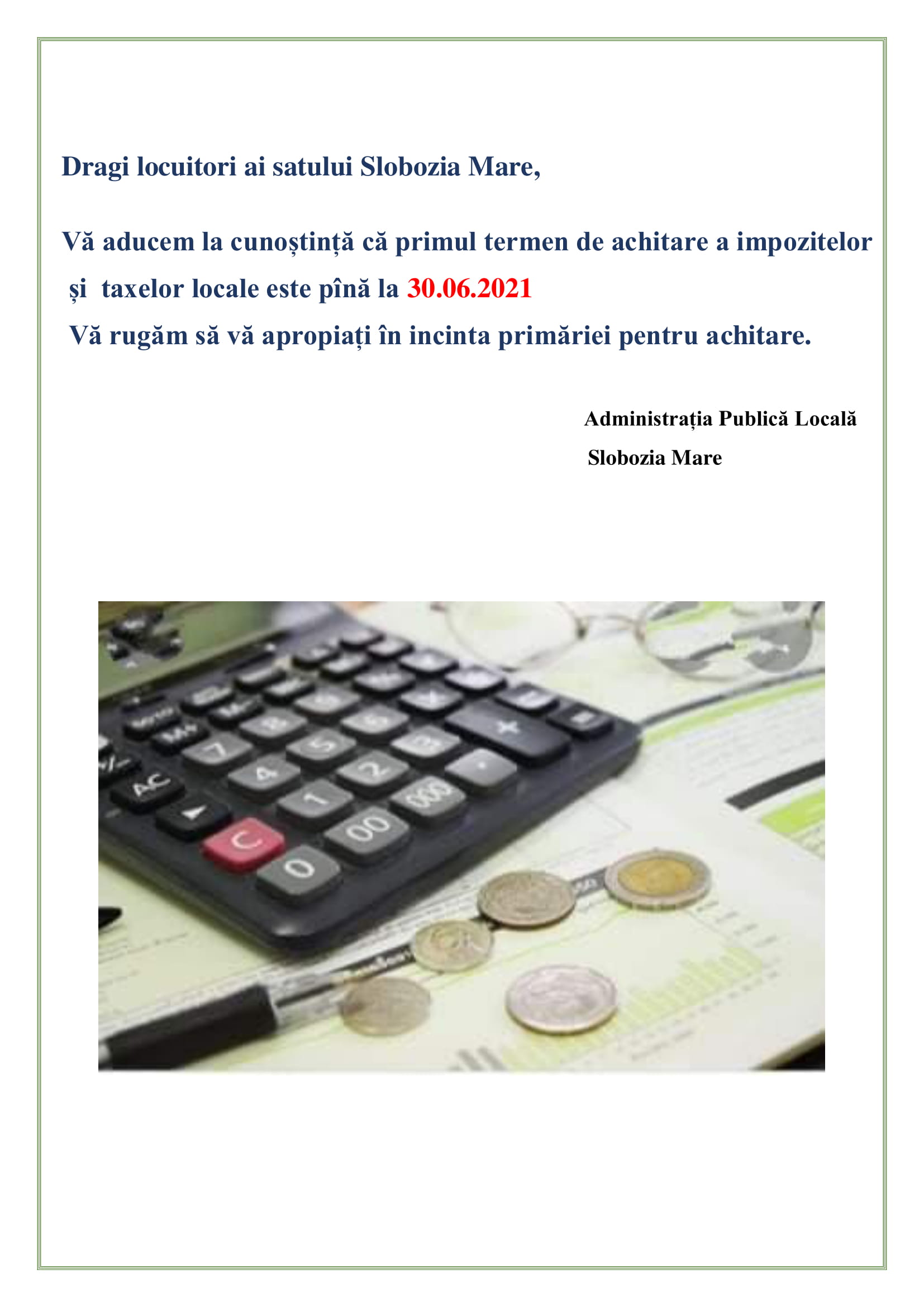 7 aprilie 2021 - În Toate Publicat de Primăria Comentarii dezactivate Anunț cu privire la achitarea impozitelor și taxelor locale! Au văzut: 276 Precedent 07.04.2021- Întrerupere programată de energie electrică! Următor Dispoziție nr. 24- N ” Cu privire la desfășurarea bilunarului de amenajare și salubrizare