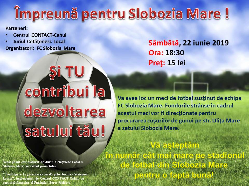 Un grup de iniţiativă din Slobozia Mare, a câştigat o mică finanţare în cadrul Proiectului:” Participare la Guvernare Locală prin Juriile Cetăţeneşti Locale”(JCL), implementat de Centrul CONTACT- Cahul, cu suportul financiar al Fundaţiei SOROS Moldova/ Departament Buna Guvernare.